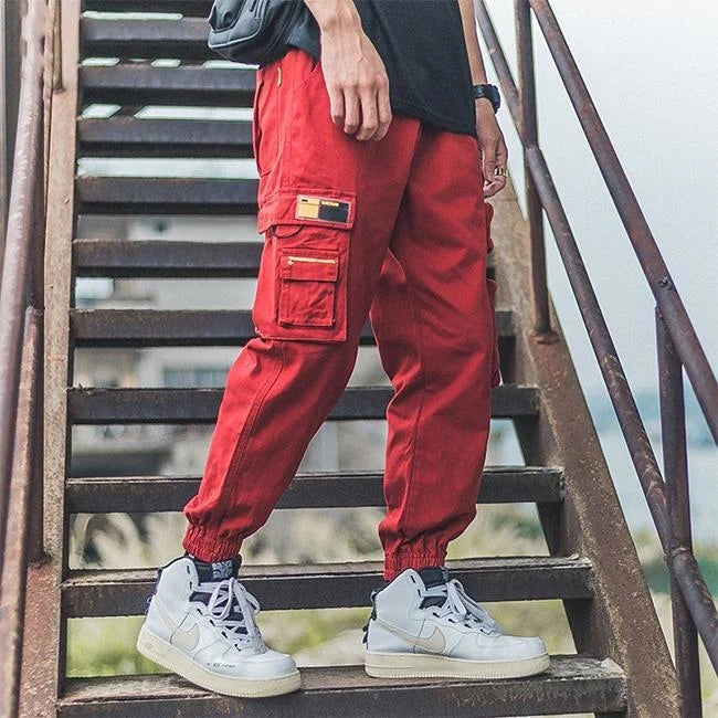 Rote Streetwear Cargo-Hose mit vielen Taschen